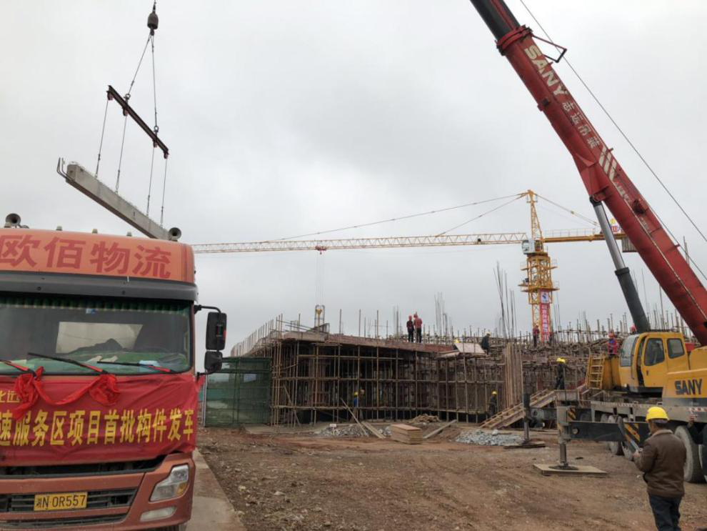 12月3日下午4時(shí)許,在清脆的爆竹聲中,在克服了層層困難后,懷芷高速房建項(xiàng)目芷江服務(wù)區(qū)北區(qū)綜合樓首批預(yù)制PC構(gòu)件到達(dá)吊裝現(xiàn)場開始組裝作業(yè)。