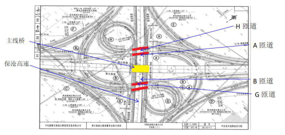 作為一個“高跨高”工程,其中有6條匝道順接保滄高速實行兩條高速公路車輛自由轉換,同時設計有5座橋梁上跨保滄高速,均采用60m跨度的鋼箱梁一次跨越,在保滄高速中隔帶內(nèi),未設置橋墩。擺在津石總包部面前有很多難題需要克服。如保滄高速交通流量大,斷交時間不足的問題;安全隱患高;賠償費用高;大縱坡,小半徑的問題;行政主管部門要求高等問題。